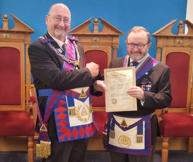On Thursday 12th February 2026, at the regular convocation of Halsey Chapter no 1479, the Second Provincial Grand Principal, E. Comp Phil Masters, presented E. Comp George Laverick with his certificate celebrating his fifty years of service to the Royal Arch.